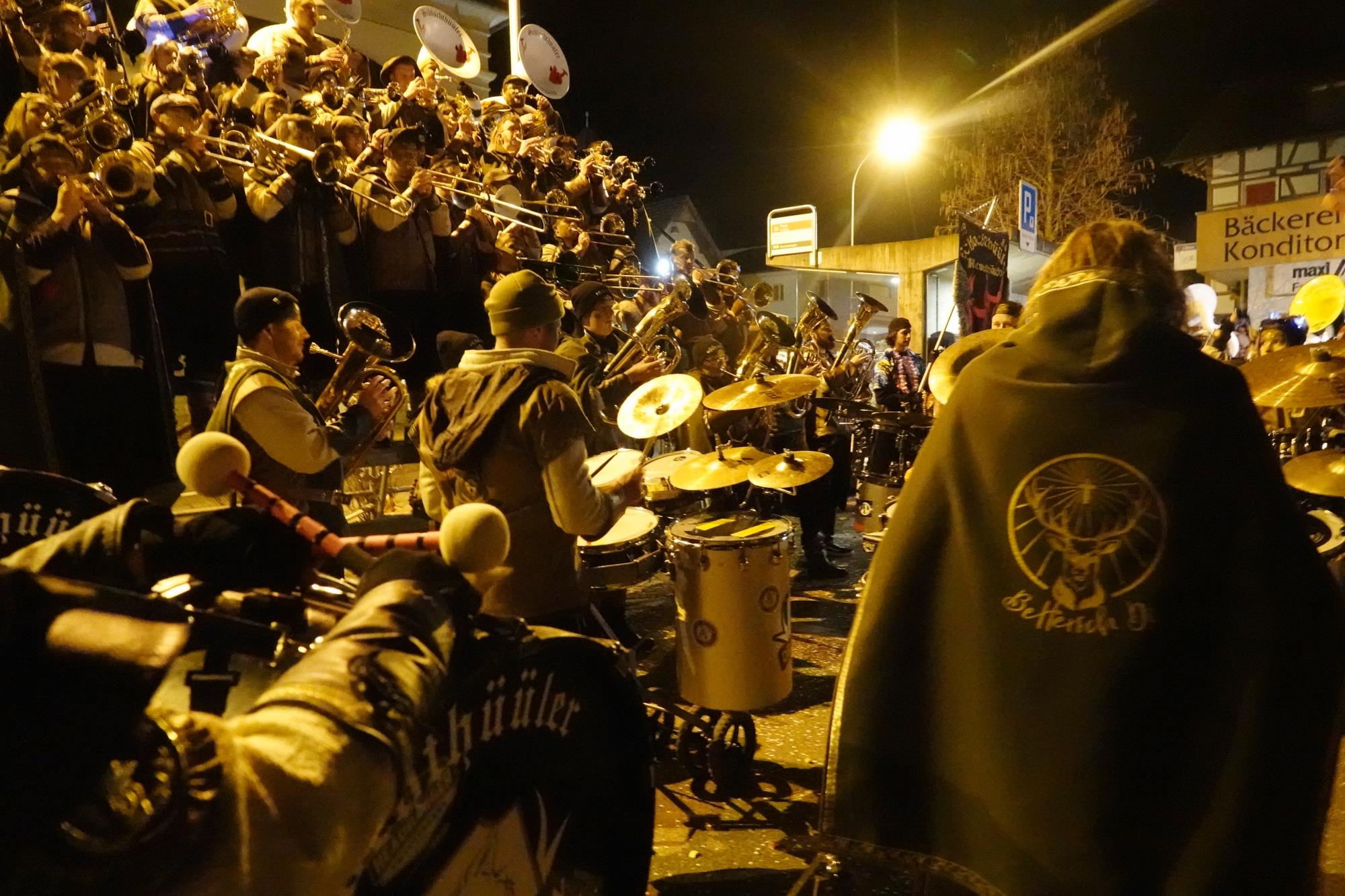 Die «Hellbühler Dorffasnacht» vom Freitag, 10. Februar, lockte viel Publikum an. Zuerst marschierten die bunt gekleideten Kinder des Familienzirkels auf dem Dorfplatz ein. Pünktlich um 19.30 stiegen die Feuerwerksraketen in den Himmel und die Bielbachfäger Rusmu eröffneten das Monsterkonzert. Es folgten die Schlochthüüler Neuenkirch, Bäribrommer Sempach, Neuechöbler und die Schopperassler Buttisholz: Sie alle sorgten an diesem kalten Abend mit rüüdigen Klängen für warme Herzen. Währenddessen heizte die Partyband «Grenzenlos» im vollbesetzten Festzelt die Stimmung so richtig an. Es wurde geschunkelt und mitgesungen, was die Stimmen hergaben. Die «Hellbühler Dorffasnacht» fand dieses Jahr in einem etwas grösseren Rahmen statt. Der grosse Publikumsaufmarsch bewies, dass die Hellbühlerinnen und Hellbühler diesen Vorfasnachtsanlass überaus schätzen. Text und Fotos Roland Meyer