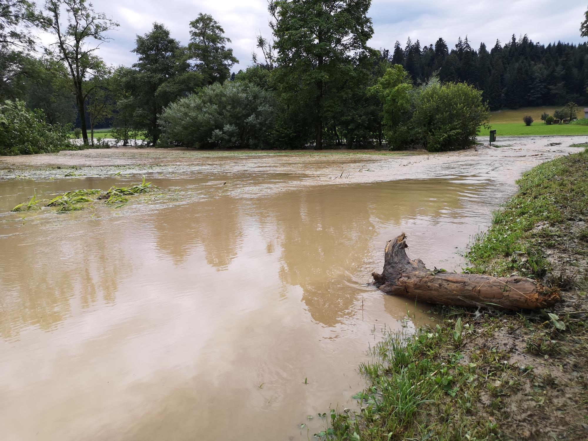Überschwemmter Tändlibach bei der Surbrunnematte hinter dem Feuerwehrlokal. Foto Josef Stirnimann-Maurer