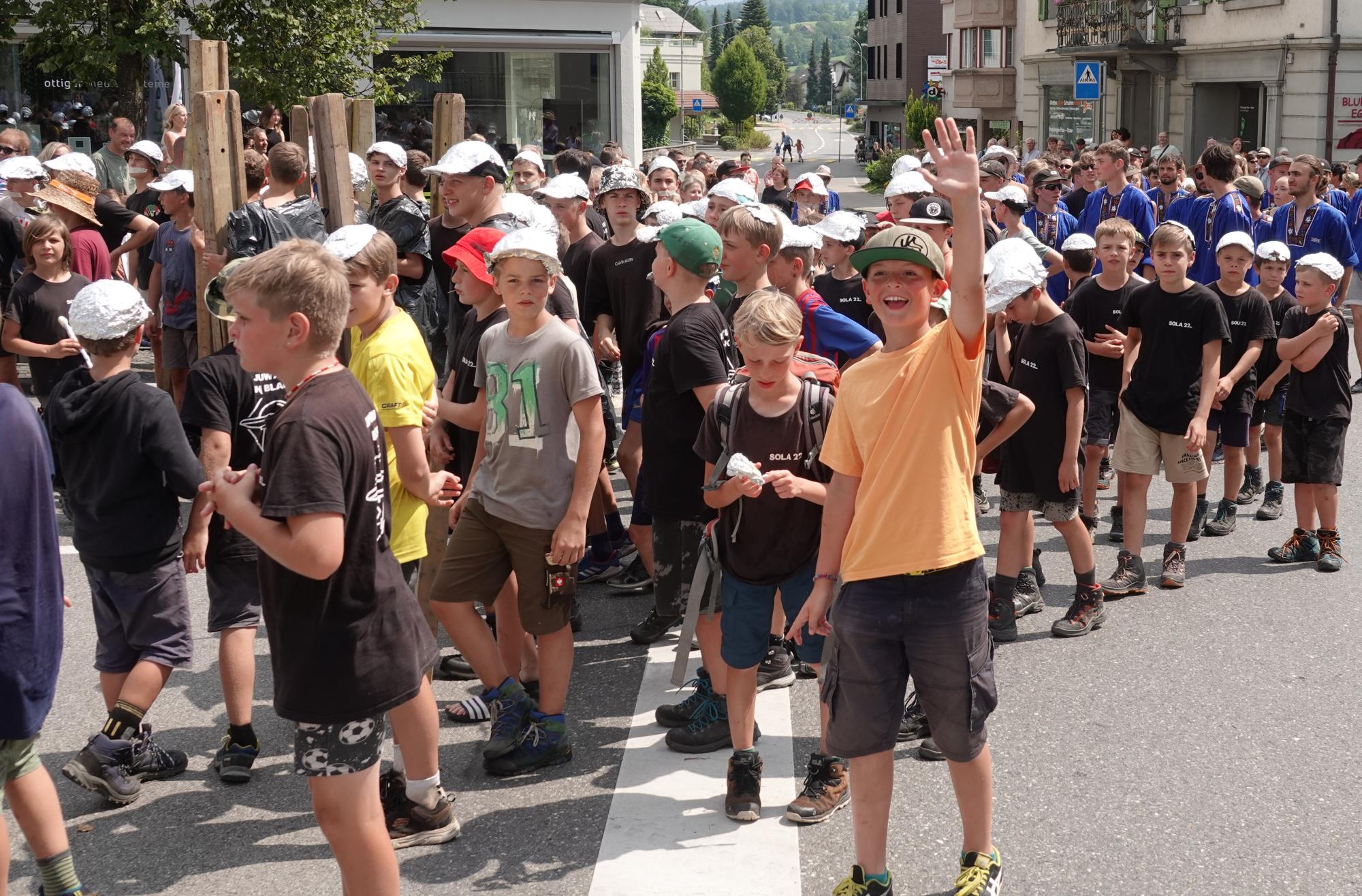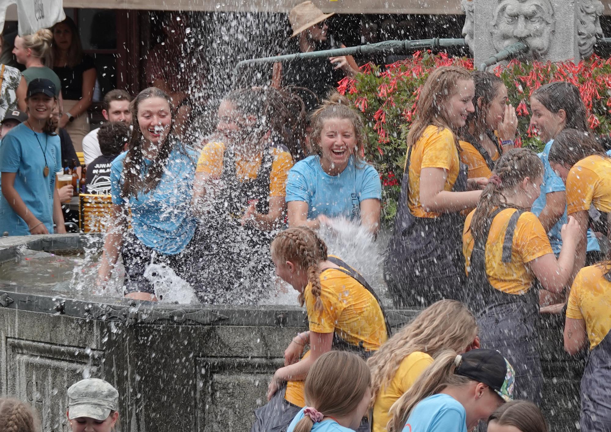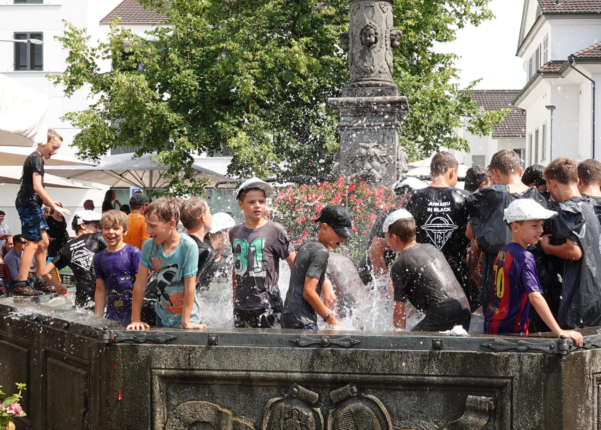 Blauring und Jungwacht Ruswil kehrten von ihren Lagern zurück und zogen unter grossem Publikumsaufmarsch ins Dorf ein. Nach der Begrüssung stand die obligate Wasserschlacht im Dorfbrunnen auf dem Programm. Fotos Roland Meyer